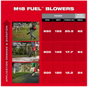 The M18 FUEL™ Dual Battery Backpack Blower is designed for the professional, delivering a higher blowing force than up to 60cc gas. The backpack blower reaches full throttle of 650 CFM and 155 MPH in under one second, boosting productivity and control.