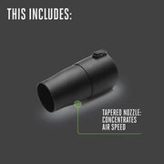 - Turbo button delivers 615 CFM, up to 170 MPH with tapered nozzle attached