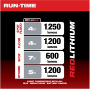 The M18™ LED search light has four output modes: spot mode, flood mode, spot/flood mode, and strobe mode, which allow you to spot from afar or flood an area up close. The high power LED searchlight can run up to 4 hours on flood mode and spot/flood mode, 7 hours on spot mode and 5 hours on strobe mode with an M18™ REDLITHIUM™ XC 5.0 Battery Pack attached.
