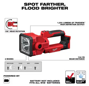 Our M18™ Search Light allows you to spot farther and flood brighter, giving you versatility, performance, and durability all in one light. The MILWAUKEE® searchlight has a pivoting head that provides 1,250 lumens of TRUEVIEW™ High Definition Output and over 730 yards of beam distance to spot objects and areas at a far distance.