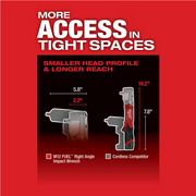 This cordless right angle impact wrench also gives you maximum access with ultimate control in hard to reach applications. Our durable cordless impact wrench easily fits into tighter spaces than traditional pistol-grip impact wrenches with a profile head of only 2.2”. This allows you to be more productive by decreasing your need for socket extensions often used with pistol-grip impact tools.