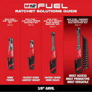 The M12 FUEL™ 3/8" Extended Reach High Speed Ratchet is the latest addition to Milwaukee's best-in-class lineup of battery-powered ratchets. These MILWAUKEE® M12 FUEL™ ratchets provide industry-leading speed with a slimmer head profile than ever before, and an extended neck that will provide the longest and most convenient reach in tight spaces.