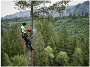 The saw has a professionally demanded feature set including an easy access chain tensioner, automatic oiler, metal bucking spikes, onboard scrench storage, lanyard loop, and climbing scabbard.
