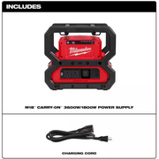 Our M18™ CARRY-ON™ 3600W / 1800W Power Supply provides the most versatile 15A power for the jobsite, with less hassle. The power supply delivers 3600 starting watts,1800 running watts of pure sine wave inverter energy with longer sustained power. Our users can run demanding trade tools, such as table saws, pancake compressors, or even pipe threaders. Power everything from 15A tools to your sensitive electronics, with instant start technology and better-sustained power.
