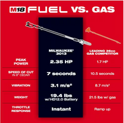 The saw’s POWERSTATE™ Brushless Motor™ delivers 2.3HP peak power, making it the industry’s most powerful telescoping pole saw. M18 FUEL™ technology allows the saw to reach its full throttle 25m/s chain speed in under 1 second, delivering the fastest cutting in its class. In addition to outperforming gas competitors, the saw eliminates all of the headaches associated with gas engines, such as pull starts, high noise levels, emissions, and regular maintenance.