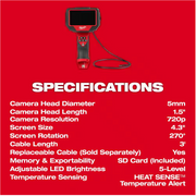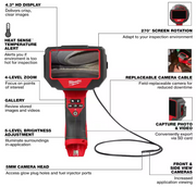 Equipped with HEAT SENSE™ Temperature Alert technology, if the vehicle being inspected is too hot to use the camera without potential damage, the borescope notifies the user and shuts down, helping the technician extend the life of their cable. Field-replaceable camera cable (48-53-3150) for reduced downtime.