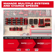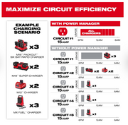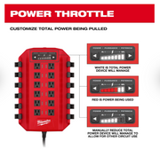 Our Power Manager for 20-amp branch circuits allows users to manage a larger number of M12™, M18™, and MX FUEL™ chargers to charge more batteries. Our Power Manager enables users to maximize the capabilities of their electrical infrastructure and avoid tripped breakers. Designed for use with battery chargers, the Power Manager monitors the power being pulled from each outlet and energizes the maximum number of outlets possible. The Power Manager automatically turns on additional outlets as batteries finish charging and power becomes available.