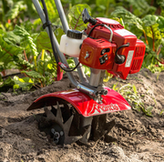 A compact, lightweight tiller that delivers big tiller power. This mini tiller breaks through sod and clay faster and easier than using a shovel. The Mantis® Tiller/Cultivator easily gets into tight places where big, front-tine tillers can't go. Lightweight and compact with fold-down handles for easy storage and transport. Over-molded grips for supreme comfort even when using the tiller in rocky soil. Ergonomically flared for maximum wrist comfort and fatigue-free operation. Features a powerful 2-cycle engine (requires gas/oil mix) with push-button priming for easy starts. While lightweight and compact, this tiller delivers big tiller power.