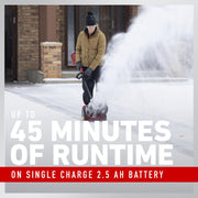 Flex-Force power source features a 2.5 Ah battery with a run time of up to 45 minutes on a single charge—and a 60 minute recharge time. Cordless, push-button start, easy-store, low maintenance—it’s a winter win, win and win some more.*Battery manufacturer rating = 60V maximum & 54V typical usage. Actual voltage varies with load.