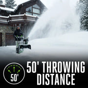 The EGO POWER+ Cordless 2-Stage Snow Blower exceeds the power and performance of gas-powered snow blowers without the noise, fuss, and fumes. Featuring Peak Power™ technology, this cordless electric snow blower combines the power of any two EGO 56V ARC Lithium™ batteries to tackle the toughest snow conditions and what the snowplow leaves behind with ease—and throws it up to 50 feet. Its 24-inch clearing width and 20-inch intake height handles even the deepest snow, and its variable-speed auger and 200-degree chute direction give you complete control to throw snow where you need it. Get the job done easily with variable-speed self-propelled forward and reverse directions along with four LED lights for added visibility in early morning or evening. Experience Power Beyond Belief™ with the EGO POWER+ 2-Stage Cordless Snow Blower and the entire EGO POWER+ lineup.