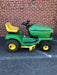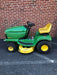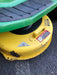 This is a good, used mower in fair condition overall. The engine hood is cracked in several places, and the anti-scalping wheels and side discharge chute are missing from the deck. The following services were performed by our service department prior to listing: Carburetor and fuel system have been cleaned (Note: There is a slight surge when engine is at no-load idle speed, but runs very well under load and at high RPM). Spark plugs were replaced. Valve adjustments were checked. Deck frame was straightened, and spacer was installed to correct bent spindle mount area. Blades were sharpened. Mower is ready to go.