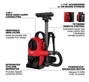 Our M18 FUEL™ 3-in-1 Backpack Vacuum brings unmatched versatility and mobility to job site cleanup. Given its unique form, this product is optimized for extended floor and overhead cleaning, among other everyday job site cleanup tasks. This product comes equipped with an integrated cyclone separator to maintain productivity and reduce downtime spent cleaning filters. The separator provides the HIGHEST SUSTAINED SUCTION & LONGEST FILTER LIFE of any job site backpack vacuum. The POWERSTATE™ Brushless Motor and REDLINK PLUS™ Intelligence deliver 70 CFM and 55” of suction for effective cleanup of common job site debris. This tool has the run-time to tackle most jobs with OVER 40 MINS of CONTINUOUS CLEANING (over 1,350ft2) when paired with an M18™ REDLITHIUM™ FORGE™ XC8.0 Battery on MAX RUN-TIME mode. With a 3-in-1 design for Wear-Hang-Carry capabilities, this vacuum delivers ULTIMATE VERSATILITY for various cleanup tasks and a padded harness, providing MAXIMUM COMFORT. This backpack vacuum offers full control of power and modes with a tethered remote that can be stored on the harness, vacuum, or user. The kitted ergonomic handle reduces wrist fatigue and allows extended cleanup for added comfort. All (5) kitted accessories have dedicated onboard storage for added convenience. The included HEPA Filter ensures optimal dust and fine debris collection. The M18 FUEL™ 3-in-1 Backpack Vacuum is optimized for countless job site cleanup tasks.