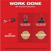 Our M12™ Brushless Pruning Shears deliver the fastest, most controlled pruning while reducing fatigue. These pruning shears deliver the power to cut up to 1-1/4” branches while providing the ability to lock the blades into half of that capacity through the mode select board, increasing application speed by 40%. The M12™ Brushless Pruning Shears reduce muscle effort by 75% compared to manual solutions allowing users to complete tough applications with ease and speed. Our Active Blade Control enables the blade movement to follow the trigger movement, providing more control over the cut capacity during application. This, combined with the mode select and lightweight, inline design, offers better accessibility and control in intricate pruning applications. When paired with the M12™ CP2.0 Battery, these pruning shears deliver up to 1,000 cuts per charge in ½” branches. Our M12™ Brushless Pruning Shears are fully compatible with 150+ solutions within the M12™ system.